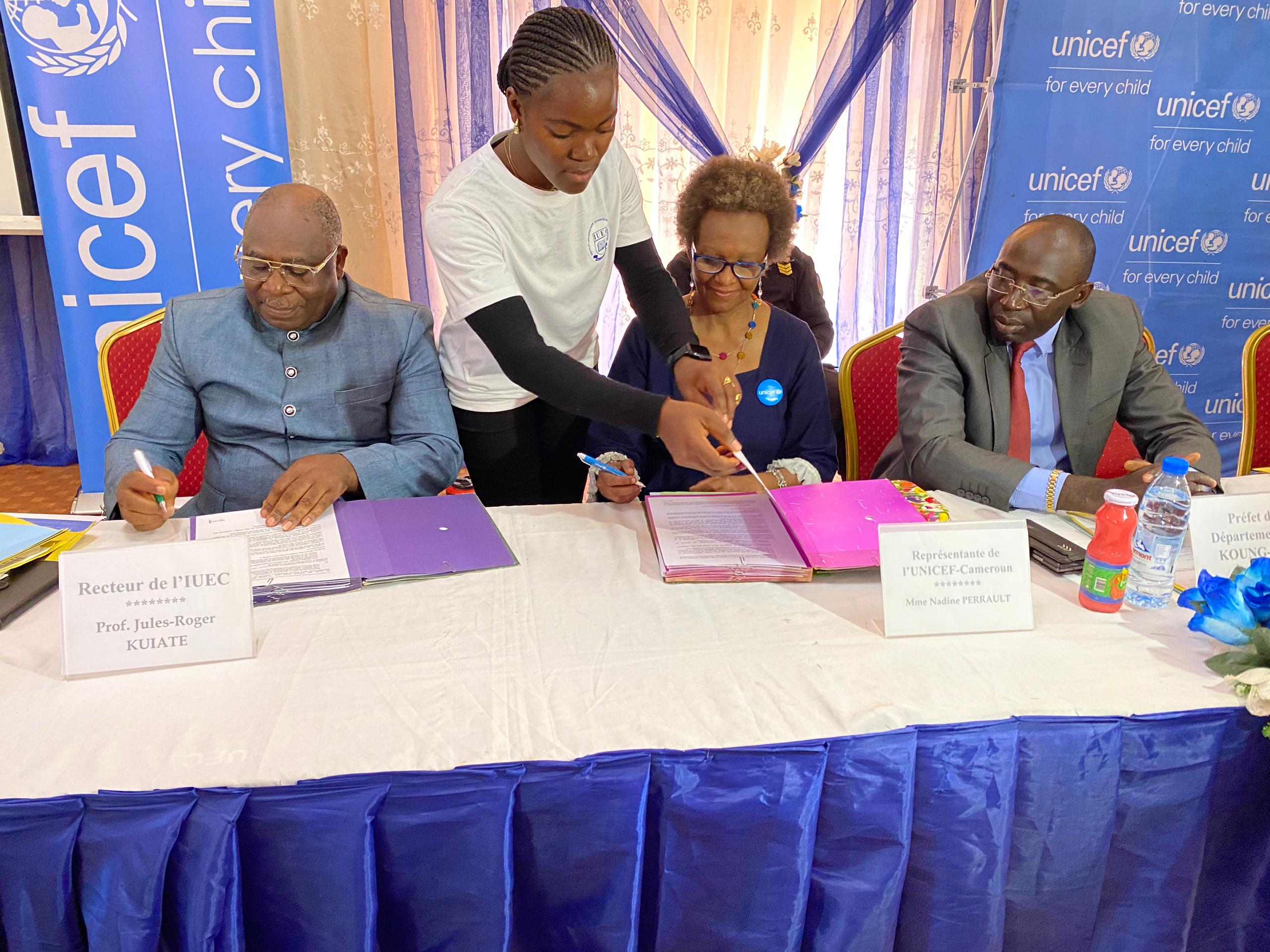 En présence de Nadine Perrault, Représentante de l’UNICEF, et du Professeur Jules Roger Kuiaté, Recteur de l’IUEC, les deux partenaires ont signé un accord.